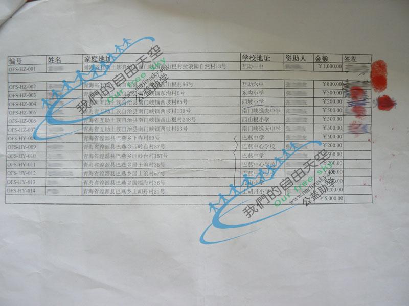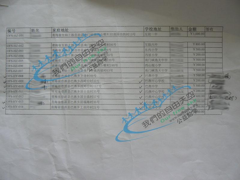 2011年青海湟源、互助共发放助学款5,700元,其中湟源助学款2,200元,互助助学款3,500元。
