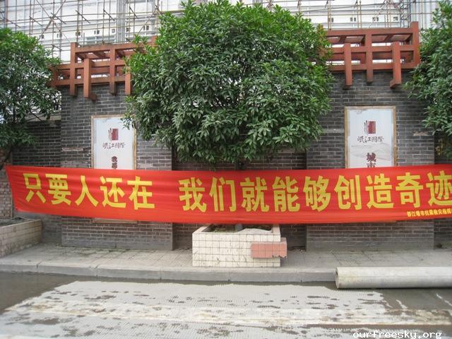 路边的都江堰市抗震救灾指挥部宣传语