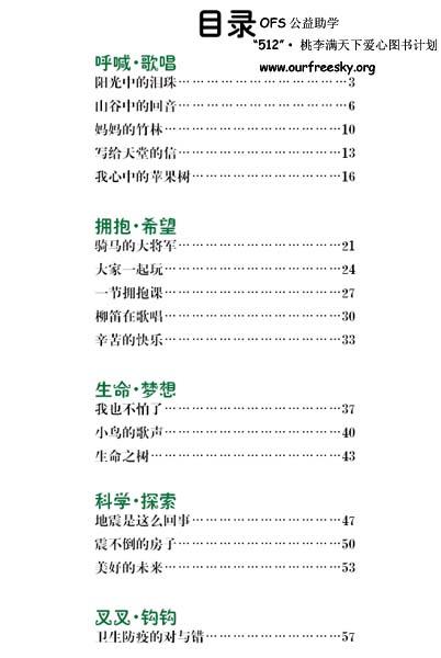 =dp(+7Va 全书分为五部分:第一部分《艉?#8226;歌唱》介绍心理宣泄的方法;第二部分《拥抱•希望》介绍心理疏导的方法;第三部分《生命•梦想》是生命意识教育的故事;第四部分《科学•探索》是关于地震自然科学的简要常识;第五部分《叉叉•钩钩》介绍了防疫卫生的简要知识。