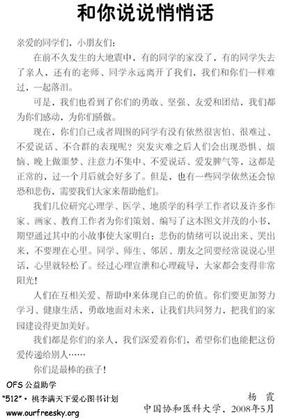 m(<zb m4r!Ck| '=V!Y$tn nF)XZB0F 本书“专家温馨提示”作者杨霞医生正在为三位由地震灾区转移来的截肢儿童做心理辅导,在她的提议下,接力出版社和中国教育电视台的有关负责人和杨霞医生一起,将本书的彩色样稿送到这三个孩子的病房里,征求了他们的意见,并且按照他们的意见作出了相应的调整。书中设计有一张愿望卡,是引导孩子畅想未来,让他们画出未来家园的,在北川中学春燕同学的建议下,愿望卡增加了一项功能:让孩子写下自己的愿望,也可以写下对亲人、朋友、老师、同学的思念和祝福。