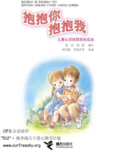 《抱抱你 抱抱我——儿童心灵抚慰彩绘读本》抚慰灾后儿童心灵,定价:10.00元,ISBN: 978-7-5448-0331-1 。经联系接力出版社发行,第一版印刷的20000册已经全部运往灾区了,如果加印需5000册以上。同时以3.41元每册的价格出售。