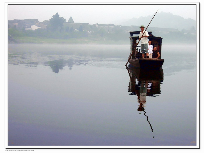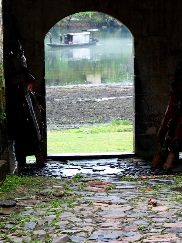 我们乘船来到对岸临潭而立的怀仙阁.停泊在悬崖下的荫凉处,崖下的书页岩就像一页一页的书本立于水中.岩崖上古藤缀拂,山径间老树垂荫.延石阶而上,踏入怀仙阁,这该是李白与汪伦把酒畅饮,吟诗作对的地方吧,因年月久远,已经变得陈旧了,脚底下的木板已是咯吱作响. 从这里望出去,潭面水光潋艳,碧波涵空,远处青山隐隐,偶尔有船儿经过,仿佛是一副写意的水墨画,那一份闲适和宁静足以让人远离尘世的喧嚣,静静聆听枝头鸟语,潺潺流水,心里一片空灵,就能这样什么都不去想,只要这一刻的烦忧未扰.....