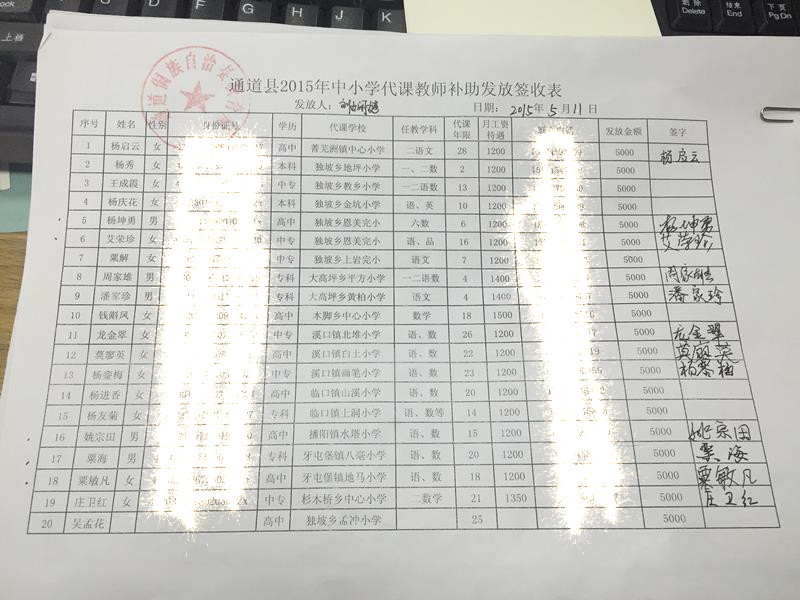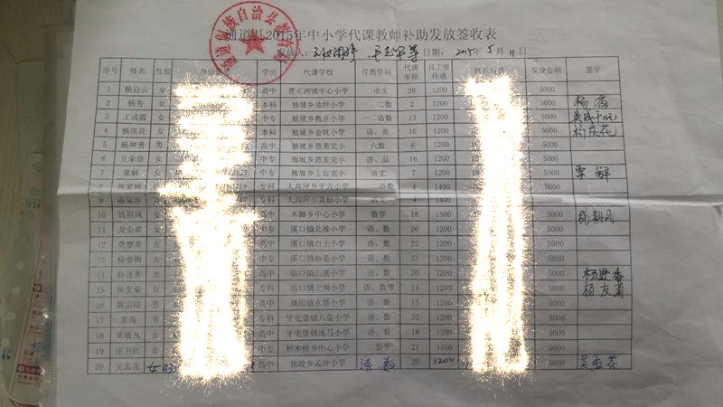 2015年5月初,OFS志愿者对湖南通道20位代课老师进行了补助发放,每位老师每个月1000元,共发放5个月,即每人5000元,共发放10万元。