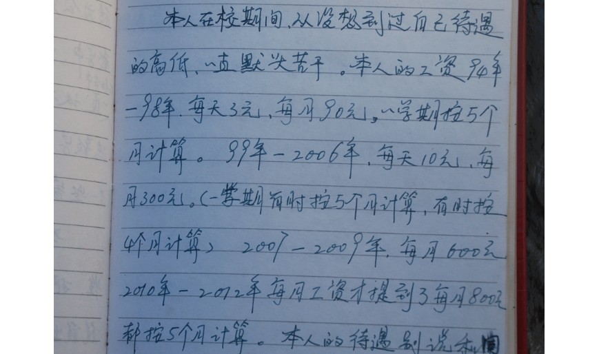 本人在校期间,从没想到过自己待遇的高低,一直默头苦干。本人的工资94年——98年,每天3元,每月90元,一学期按5个月计算。99年——2006年,每天10元,每月300元。(一学期有时按5个月计算,有时按4个月计算)2007——2009年,每月600元。2012年——2012年,每月工资才提到每月800元,都按5个月计算。本人的待遇别说和同伴教师相比,和农村的一个一般打工者相比也差的太远了。