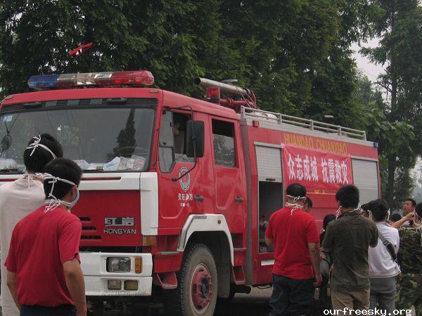 出洛水镇后,在一个不知名的小镇上消防送来了水,村民可能还是有些恐慌,所以都在抢着接水。