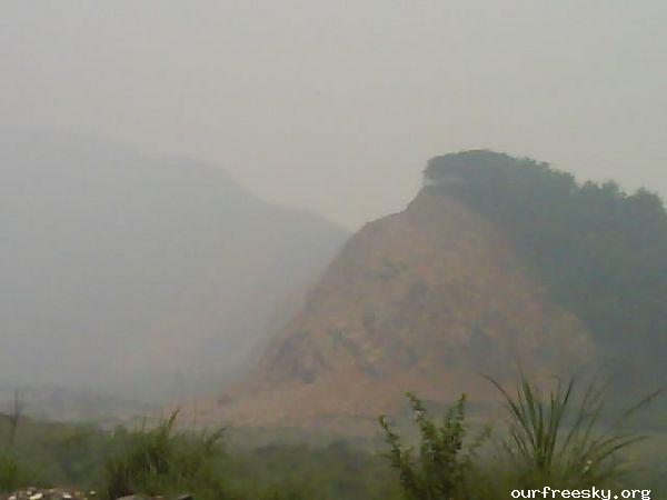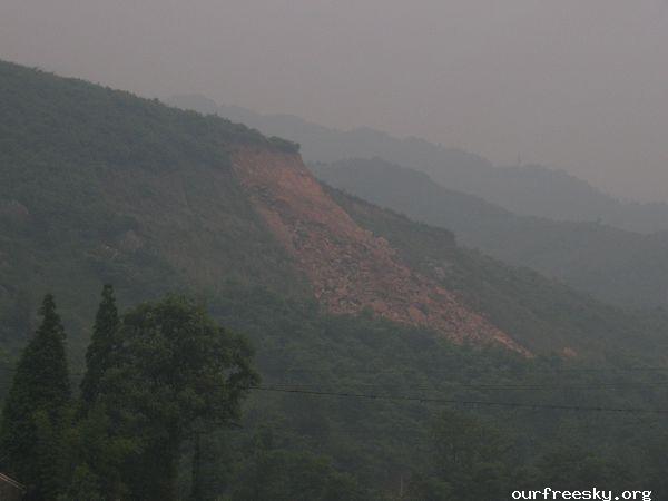 公路对面的山上塌方的山体随处可见,而山下就是一些小城镇和村子。