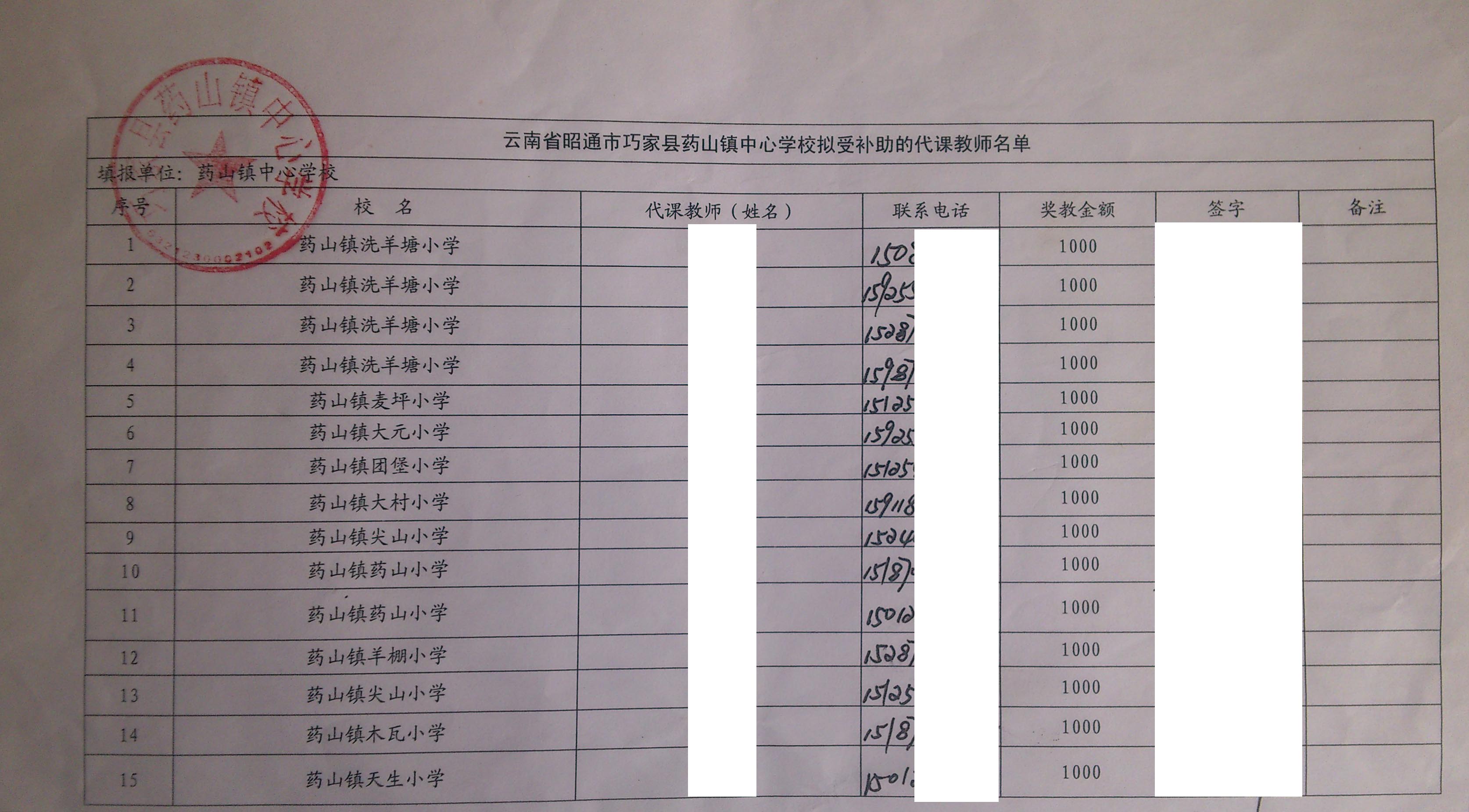 2012年春季学期云南省巧家县药山镇代课教师支持奖金发放