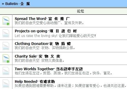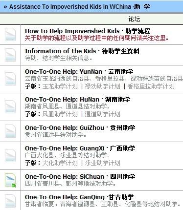 点击论坛进入。 :S!!J*0 L `=*Pwcj 论坛首页有以下几个版块: 'YYT1H) 1.互动(1楼详解) 2. 西部支教(2楼详解) 3. 助学(3楼详解) 4. 爱心书库(4楼详解) L'"c;FF02i 5. 公报(5楼详解) 6. 茶馆(6楼详解) 7. 版务(7楼详解) lH