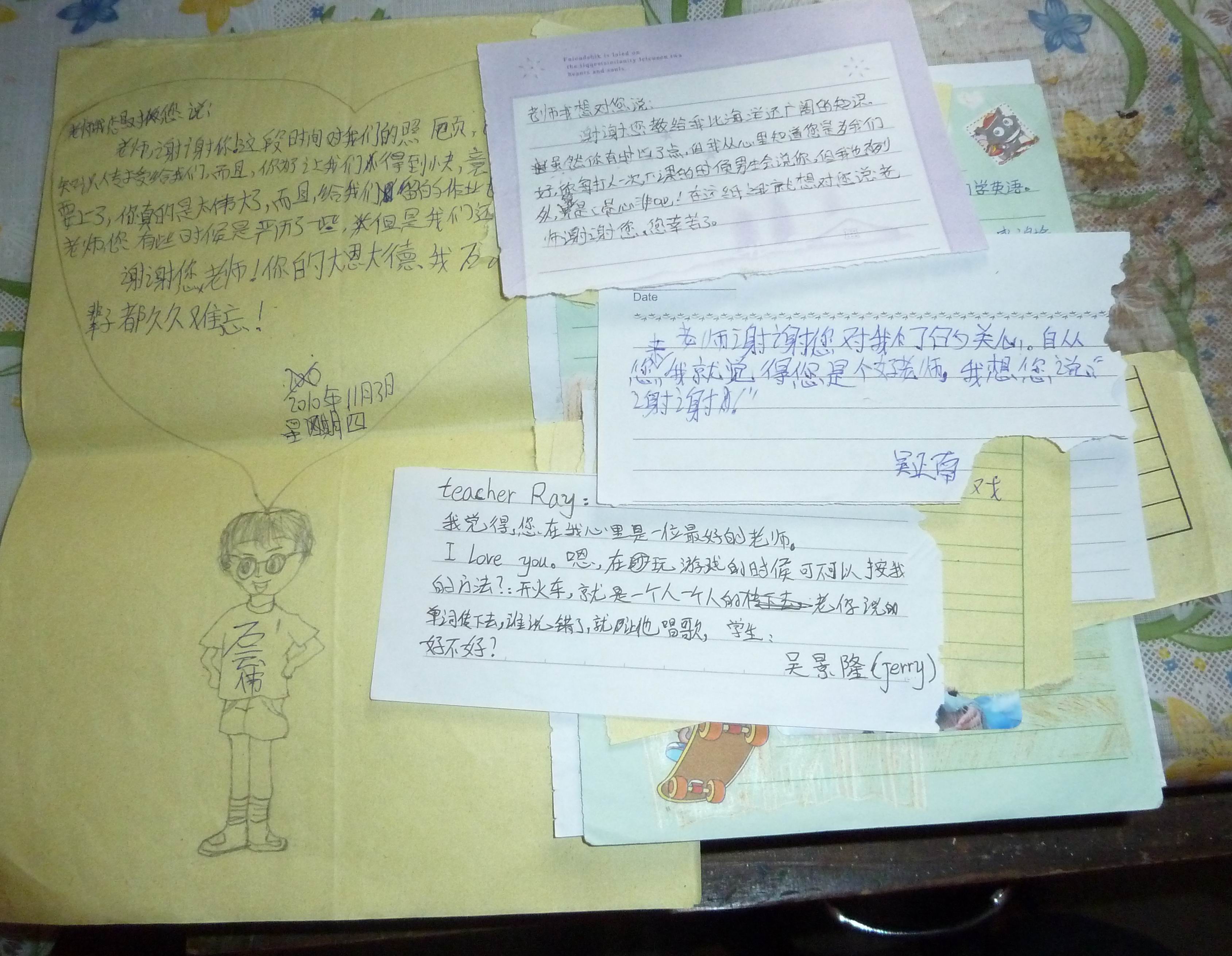 他的学生给他的小条。——我的也有,舍不得扔,放在抽屉里了。