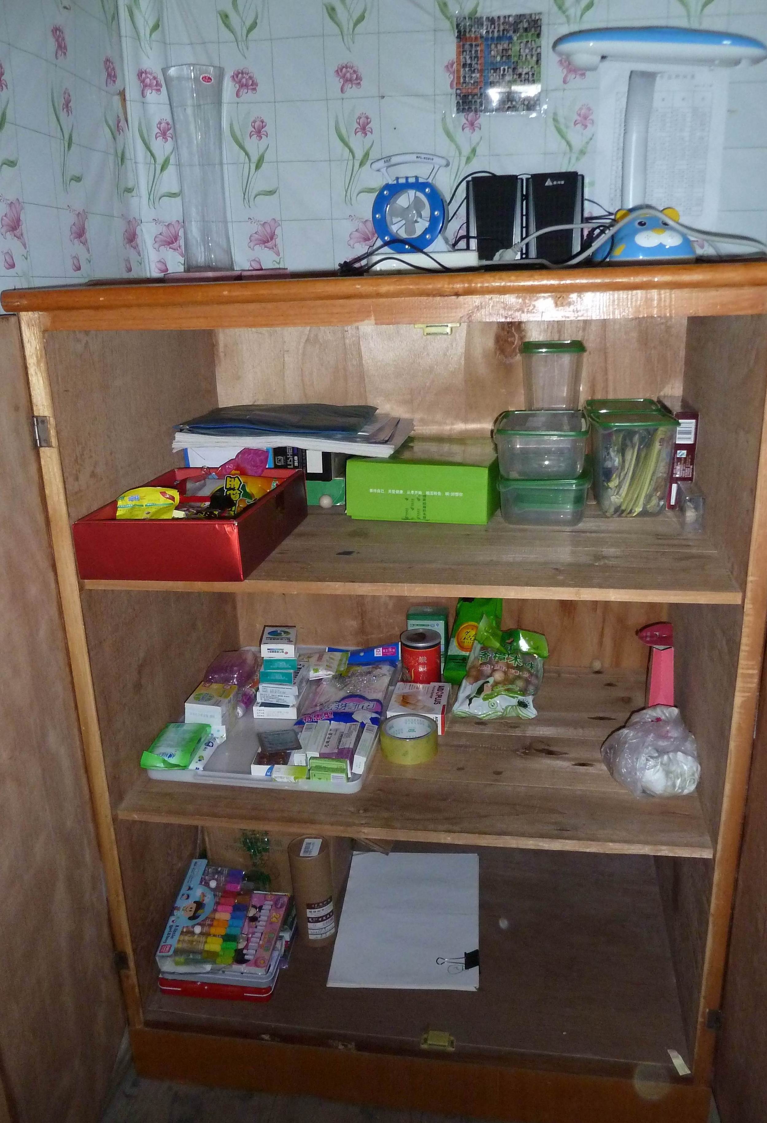 第二层是我留的湿纸巾、香皂、皂盒、洗碗布、喉片、茶叶、香樟木珠和一大堆皮肤病的药。——走之前听说山里虫子多特意弄了好多皮肤药,结果连蚊子都没咬过我,所以没用上。——PENG老师是被咬惨了的:)。