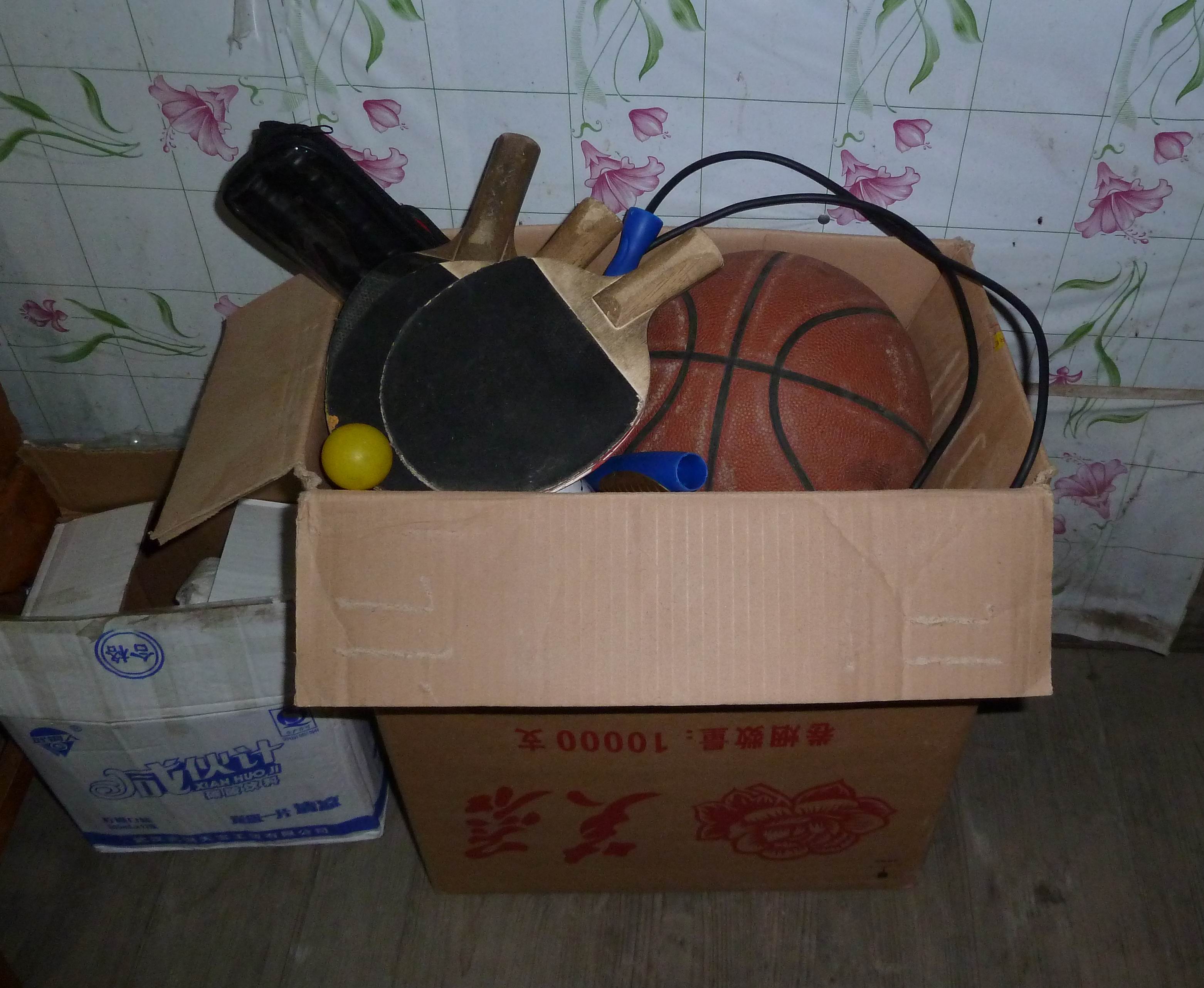 右边纸箱是体育器材,有前面老师留下的篮球羽毛球和彭老师留下的跳绳乒乓球,主要都是平时放学后给孩子们玩的。但12月的某天我发现学校某间房里屯积了好多我们OFS捐的体育用品。:(