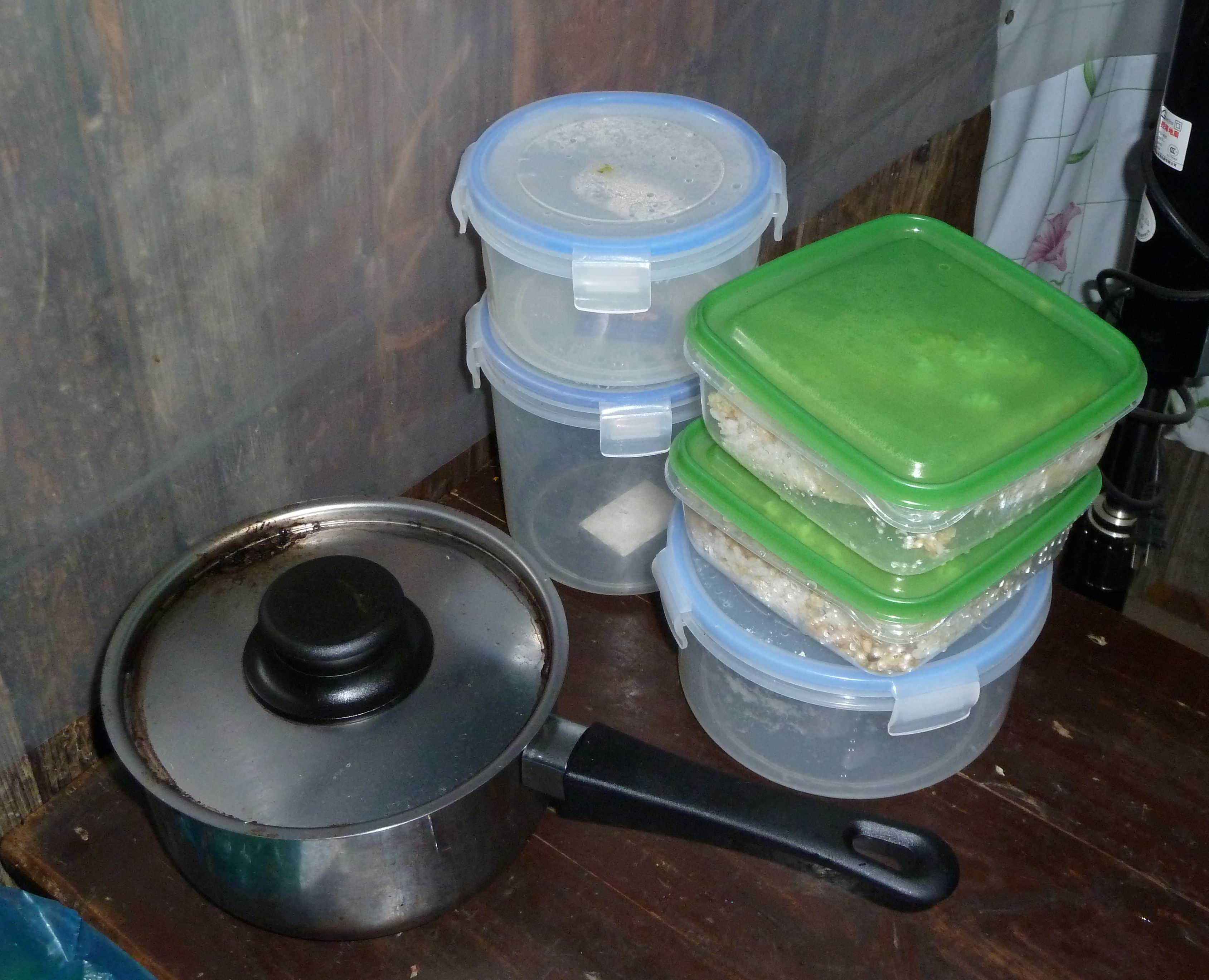 三个锅之中的中号锅和我们当碗用的保鲜盒。柜子里还有一些新的保鲜盒,不过当碗用可能尺寸不是太合适。之前老师的碗我都没有留。