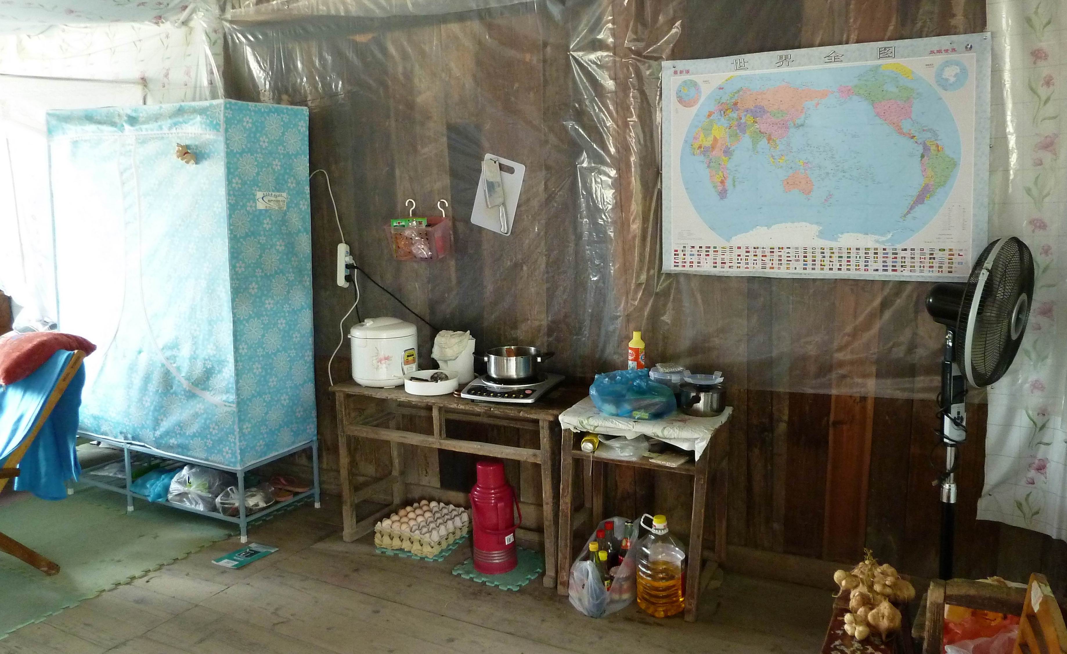 “厨房”的全景。电水壶和电饭煲是前面支教老师留下的,电饭煲有点问题,做饭时老是跳,要人看守,跳了就要往下摁直到真熟了才行,你看要不要自己带一个去。电水壶的插线是我某天可能电压不稳还是怎样烧坏了,但电饭煲的线可以和它通用,后来我就一直共用的一个插线。