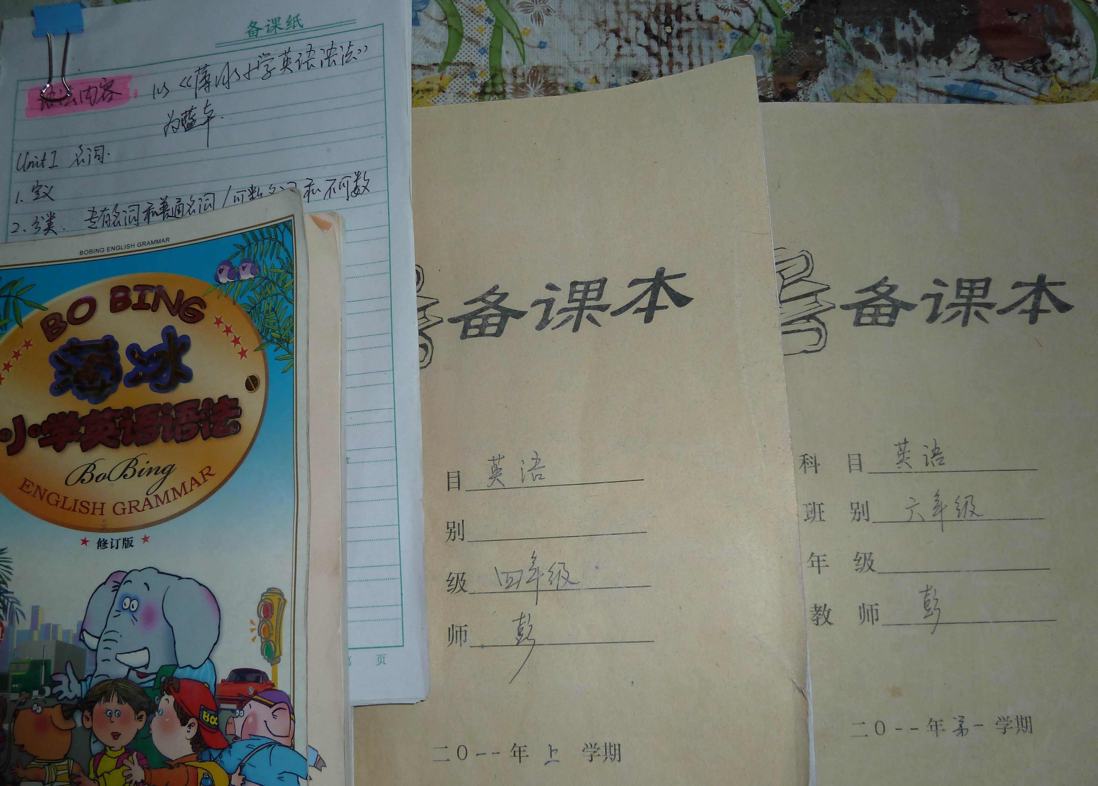 PENG老师的教案,他比较认真,教四、六两个年级的英语,一个年级一本。我教三年级英语和五年级数学,都在一个本子上,教案写得少,测验比较多,基本都是登记的孩子们的测验成绩。