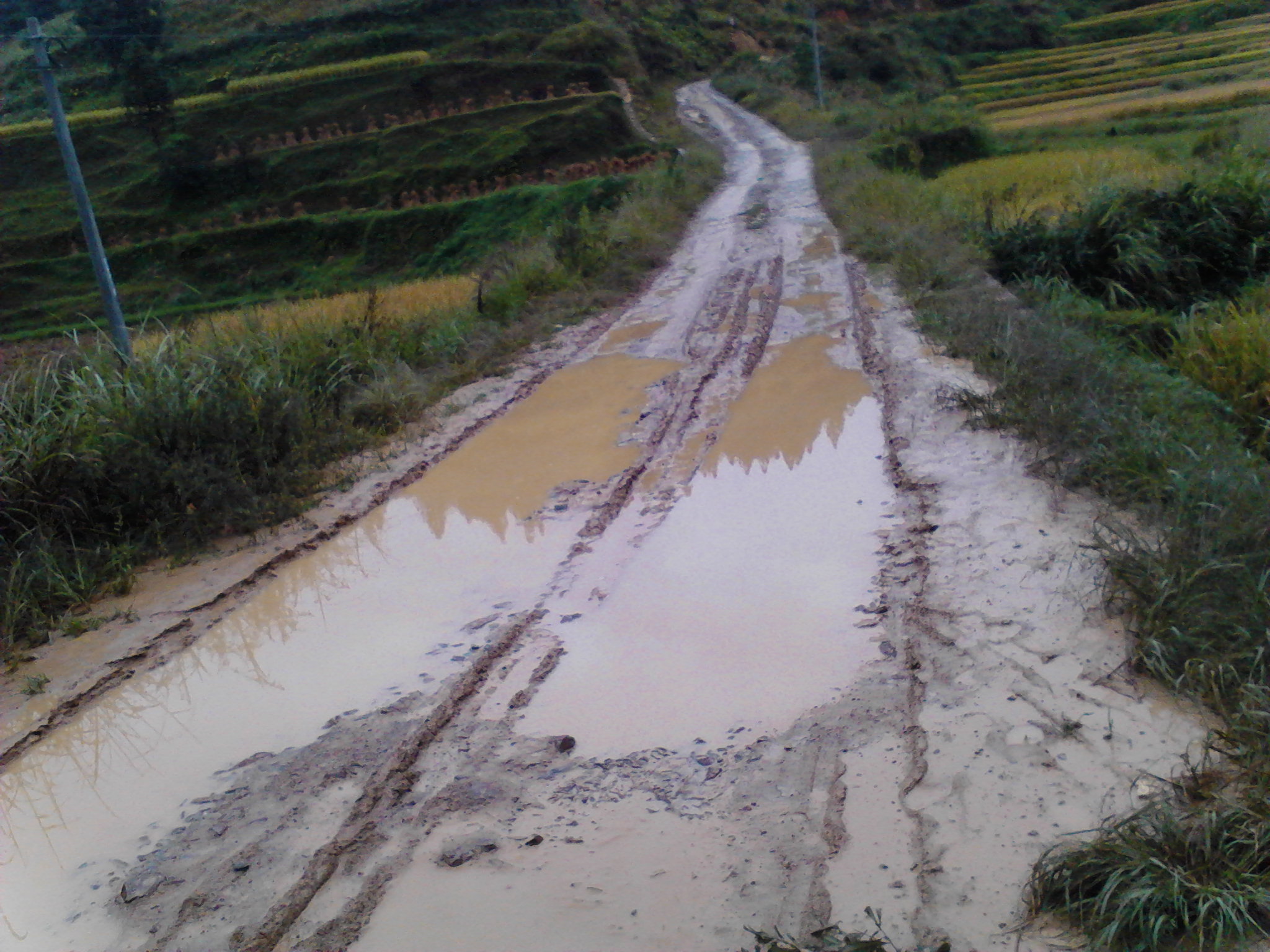 离开牌楼教学点,刚走10几米,在一个小坡上,车陷泥里了。往车下垫了些草,还是不行。用铁锹挖,再垫草,又来了几个当地村民,我和他们一起推车。费了九牛二虎的力气,好容易把车推出去了。推完车,我浑身都是泥点子,鞋上也是烂泥。