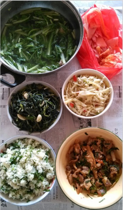 教师节,学校在食堂自个做饭过节,没课的老师去帮忙。 我们去河里洗菜回来,刚好是要去准备上晚自习的时间。大伙等到下晚自习后才开餐,自己动手,吃饱喝足。