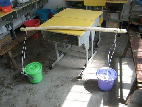 上午开课前,麻老师送过来一根“扁担”,其实就是一根削了皮的树,扁担两边分别给削了两道壕,可以放“绳子”。第一课不是我的课,就去挑水试了试,果然比拎着轻省好多,哈哈,变身湖南山区村妇成功!一天还挑了两次!撒花庆祝!哦也也,哦啦啦…