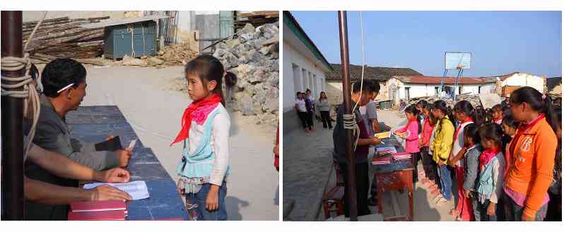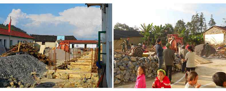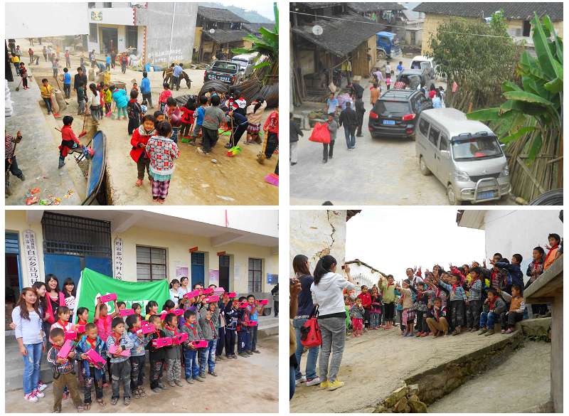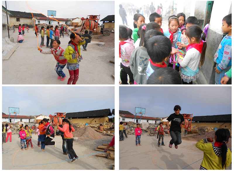 下课后孩子们立刻拿出飞盘球玩起来,其他年级的学生都围过来看,我趁机把二年级到四年级的飞盘球发了下去,站在教室和建筑材料之间狭小的空地上看他们玩得很开心。和刘校商量了一下,决定下午把表弟寄来的跳绳、毽子、象棋等东西全部发下去到各个班级去,这样学生们下课后就不会再简单地跑来跑去啦。