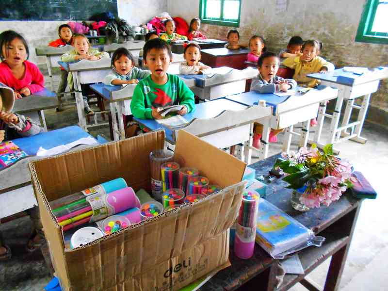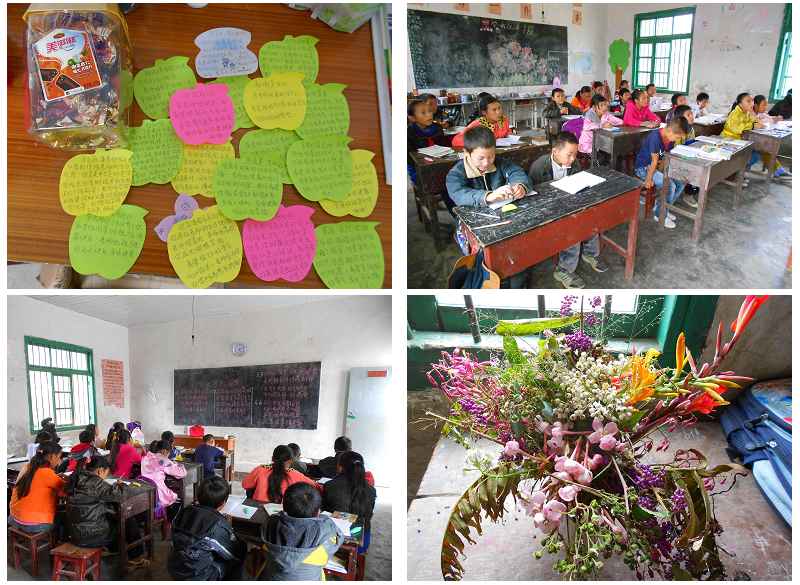 回到宿舍把这些东西整理好,塞了满满一袋子,然后又把给五年级的每个学生的回复准备好,并拿了一整盒夹心巧克力,吃过午饭就在宿舍把下午准备教给学生们的歌《让世界充满爱》的歌词写出来,上课之前,写在了五年级的黑板上,又把他们写给我的生日祝福中的错别字写在黑板上,比如“生体健康”“工作顺历”等等。我问他们是否知道我把这些词写在黑板上的原因,他们竟然还没有看出错别字来,几个男生还嬉皮笑脸的说因为这些词是都好词儿!怪不得刘校在我们初次到马马的车上就告诉我们这个学校五年级的成绩最差,全班只有两名同学期末考试及格了。挨个纠正了黑板上的错别字告诉他们正确的写法以后,我把写在五颜六色贴纸上的回复发给了每个同学,顺便把巧克力也发了下去。