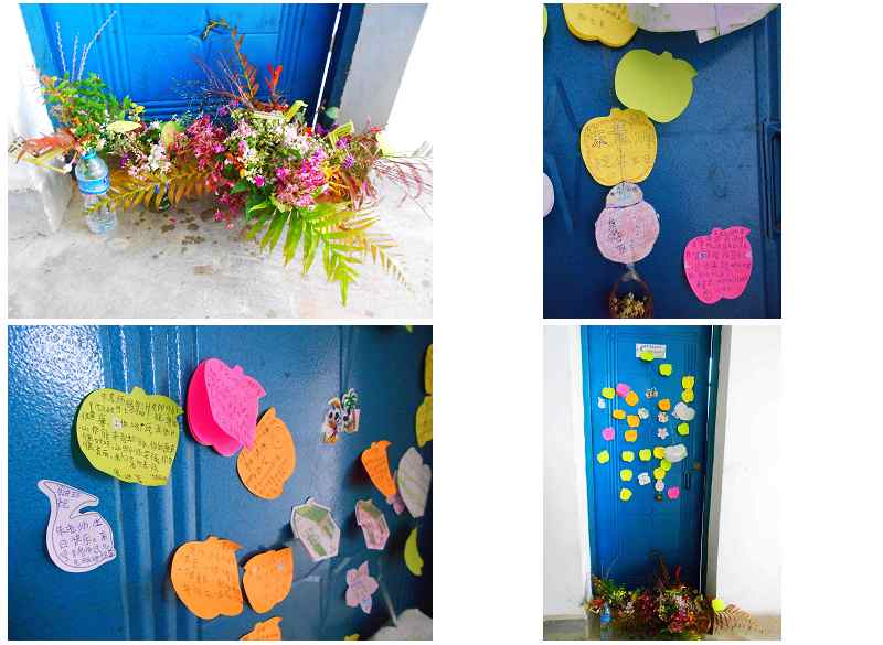 早上起床打开门简直惊呆了,门口地上堆放着满满三瓶野鲜花,还有一支红蜡烛跳跃着烛火,门上满是五颜六色的贴纸,上面写着全是祝福的话语,还有超级无敌小篮子的香喷喷的桂花,有草编成的小马,还有一颗折纸做成的大心,原来是华老师班五年级的学生趁我起床前去采摘的野花并把祝福贴满了我的房门,是,今天是在下生日呢,一定是老好华老师告诉学生们的啦,太开心啦!!