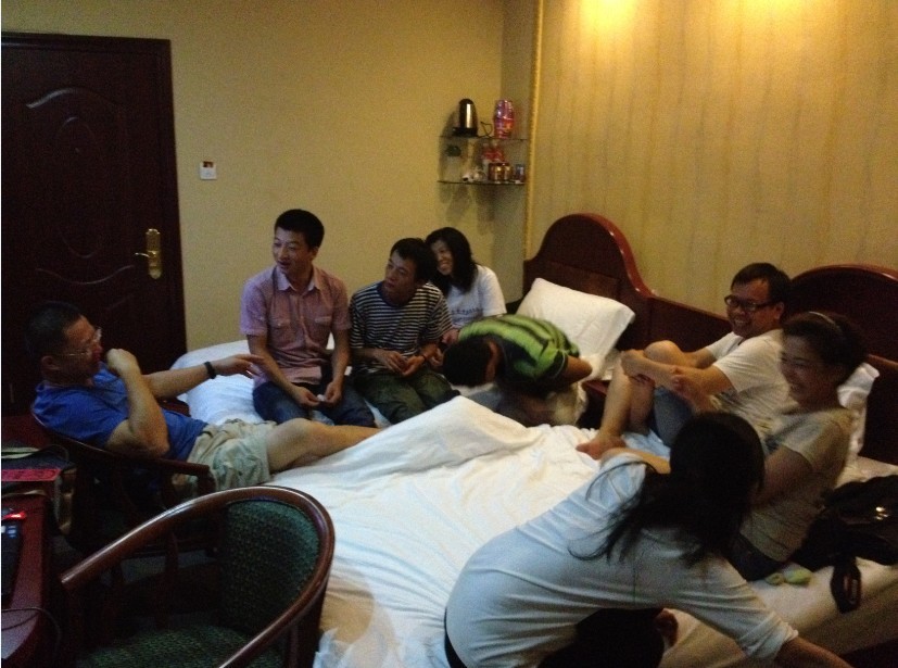 图为君悦宾馆中正在“杀人”的我们,大家笑得前仰后合,小牛老师都笑弯了腰。