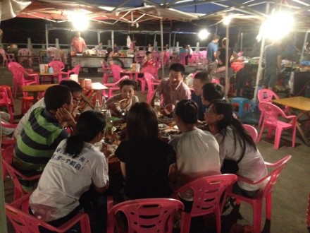 一下午就在购物,理发,畅聊中愉快地度过了。晚餐时间,有人提议去江边大排档。好主意,大家积极响应!我们走到了江边,一排排的烧烤啊,炒菜啊,真是好不热闹!我们找了一家桌子比较大的摊位坐下了。郝老师和汤老师去买烧烤了,我和小八去点菜 。一边点菜,一边询问价格。