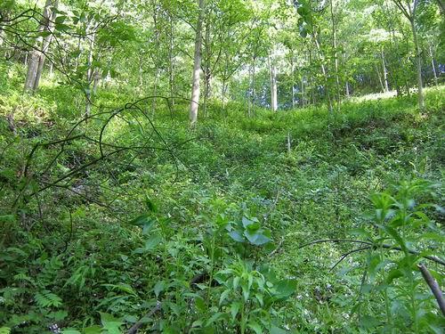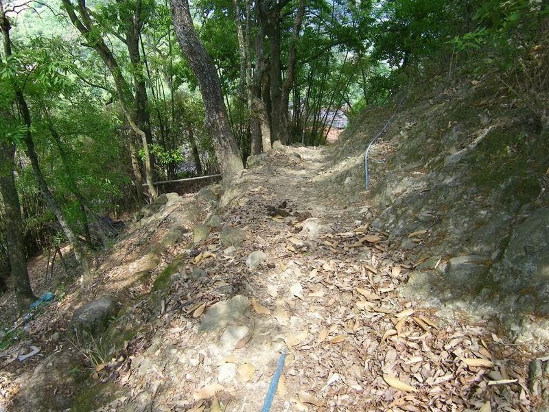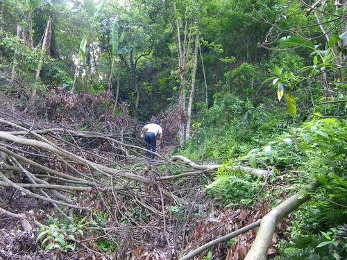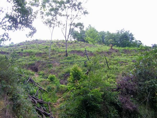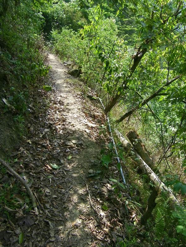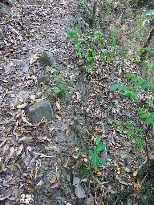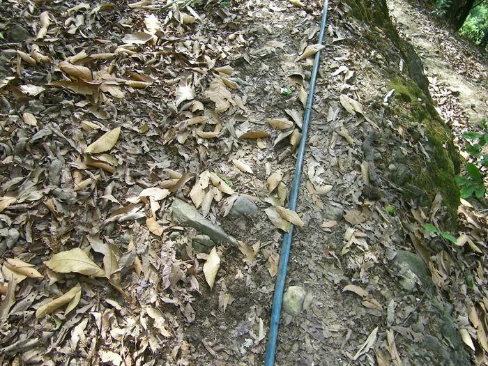 我和罗主任早点每人吃了两只蛋,7点多,趁着凉快,开始向水源头出发。这是2公里的山间小路,崎岖狭窄但植被茂密。2000米的塑料引水管虽然当初挖埋过,但后来由于村民随意砍用和维护需要,现在多处裸露在外,有一段横跨路面的管子已被人畜踩踏扁了。越接近水源头,越不成路,不时要跨越或钻过横倒的树木,攀爬溪涧的山石。有点像走原始森林的天然林道,陡增了探险的趣味。