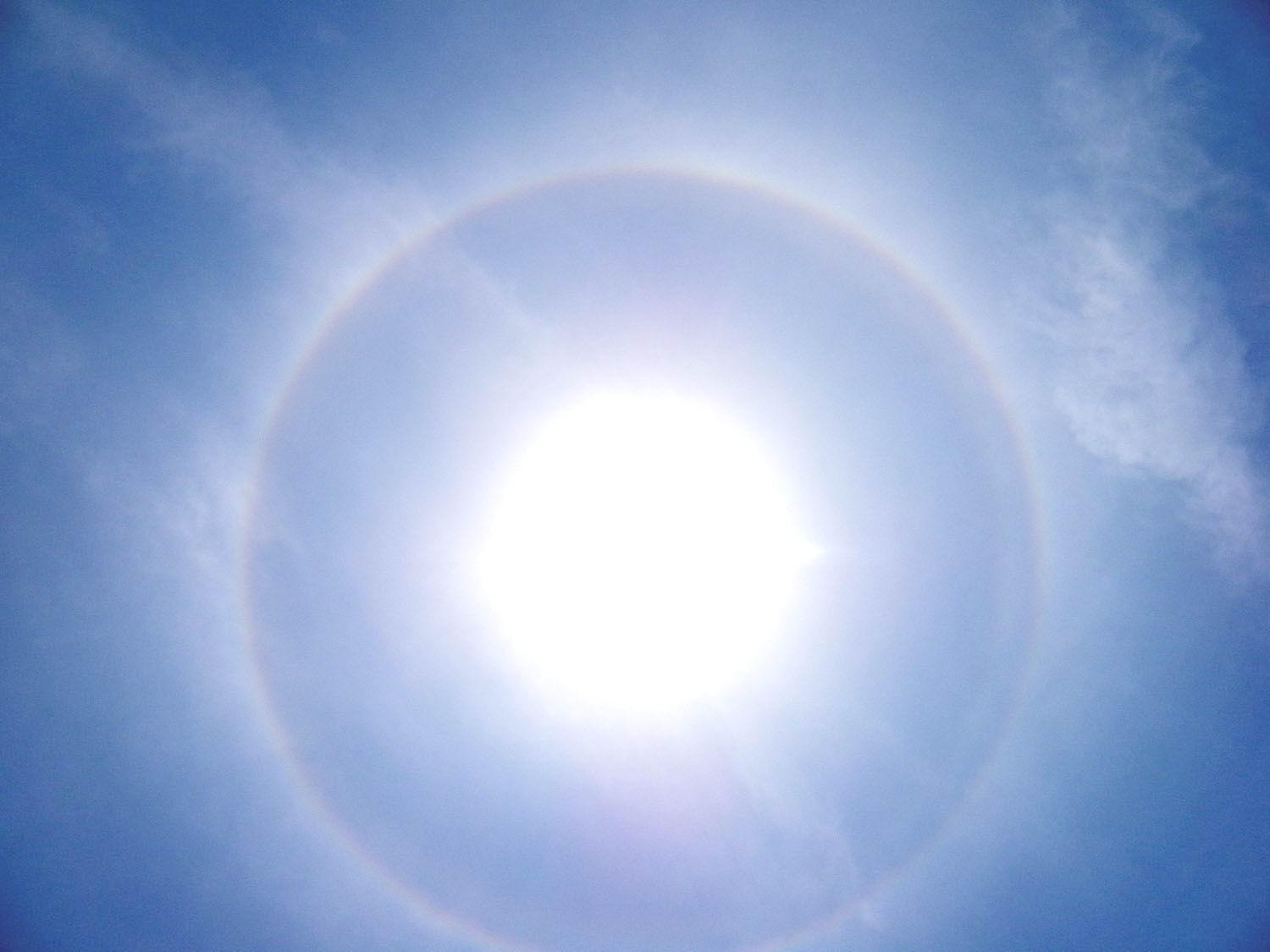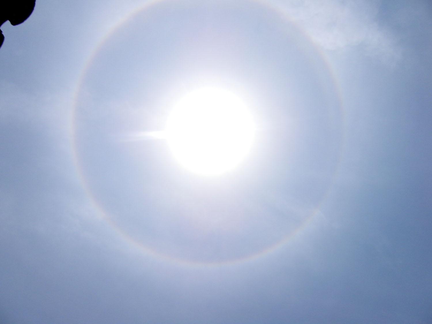 中午看了会儿书,大约12:30左右,正打算眯瞪一下。忽听一个学生在门外叫:“老师,快来看呀!太阳戴了好大的帽子!”我觉着新奇,赶紧出门看天。果然,太阳周围有一圈深色的圆盘,最外面是一圈七彩光环,既壮观又神奇。“日晕!”我大叫起来。月晕经常见,日晕我可是头一次见,真叫开眼。赶紧回屋拿了相机,也顾不上镜头不能直接对太阳拍摄的禁忌了。可惜眼睛还是无法直接面对太阳取景,只好将相机举在头顶“盲拍”。日晕的直径很大,“盲拍”无法取准全景,只能凑合留个纪念。罗主任在隔壁听到动静也跑出来看,他说也是第一次见。可是学生说每年都可以见到一、二次,真真羡煞我也。