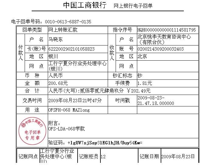 汇款金额:¥200.68(工商银行网上银行转帐)