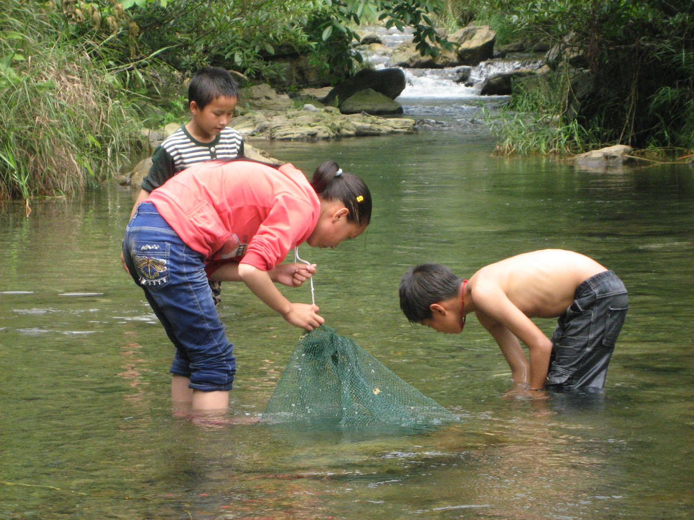 到山大沟的时候是10点多钟,这里明显门户就少很多,应该就10多户。有一半的房子是黄土混合茅草屋,另一半就是常见的黄土瓦屋了。五年级有俩位女生家在这个寨子,有一位女生的家就是茅草屋,在她家没找到她人,家里人说她去山上放牛了。到另外一位女生家,她正背着她1岁左右的妹妹,家里其他人去山里干活了,我们在她家休息了一会儿,根据她的介绍,我们决定去离这不远的一条小河里去抓鱼。半个小时左右到了河边,应该叫小溪比较合适,水非常清、很浅,孩子们一到溪边就脱了鞋子和上衣跳到水里玩去了。因为水里太舒服,其它地方也很少有水,我们在这里待了2个多小时,中午就吃我带的干粮,1点半钟我催促着大家开始往回走。