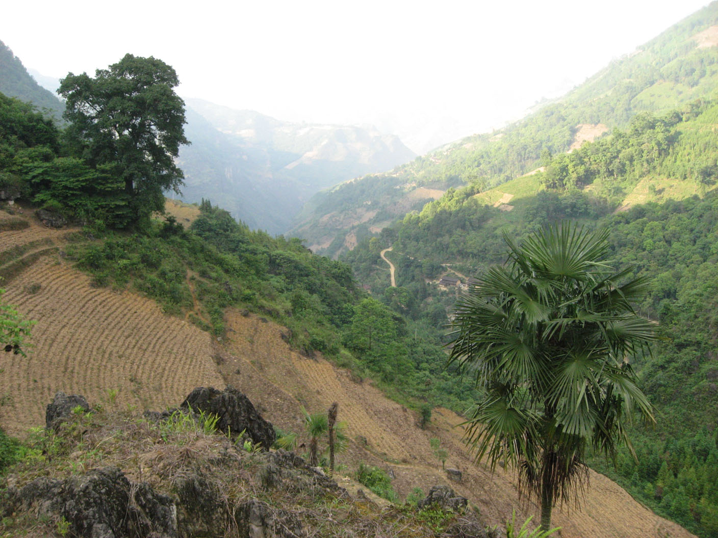 目前归马马行政村管辖的几个寨子中,就只有山大沟没有通车了,摩托车也是不行的。我们从毛木树往山大沟去,基本上一直是下坡路,视野非常好,树不多,山坡上多是种了农作物,以玉米为主,现在是刚栽没多久。上午的太阳不烈,一路很舒服。