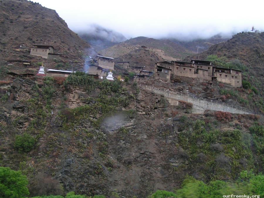 藏族民居,无论贫富,皆为层楼。底层置空,设为圈栏;中层必设厅堂,厅堂亦即厨房,置火塘于中央,供活佛于堂前,家具原木手工制作,雕栏画栋,饶富民族特色;上层为居室,屋顶覆以泥或瓦。藏居坚固实用,冬暖夏凉。村前村后必建白塔,每逢藏历时日,民众焚香燃油,聚而转经。 C [4{\3\Va