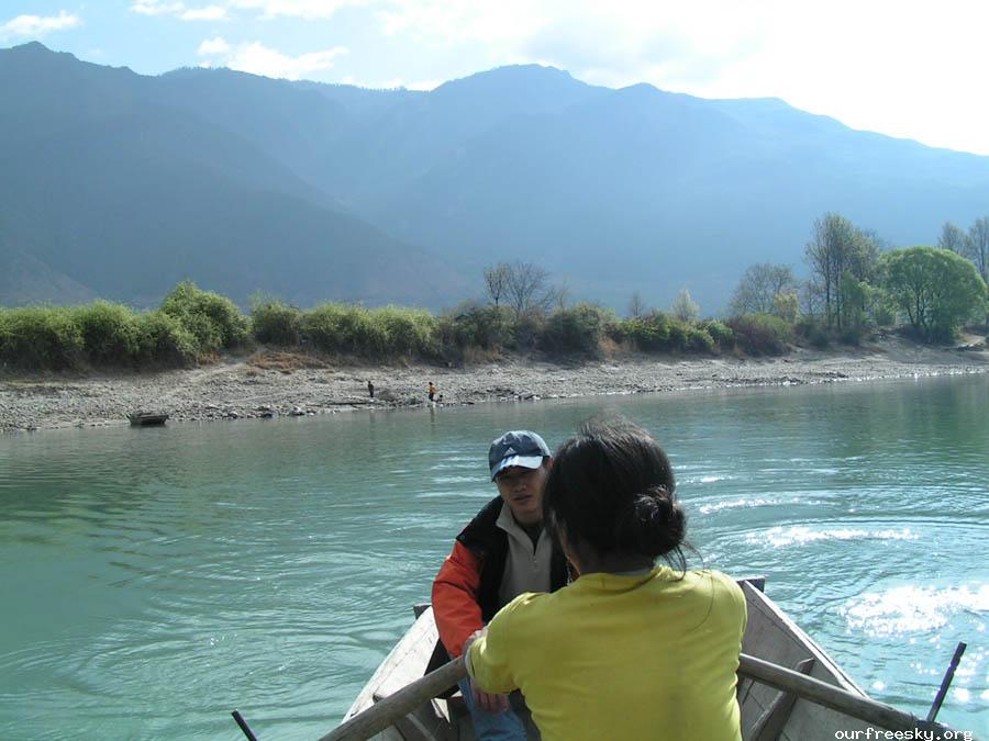 徒步至江边,临金沙江边,滩浅水平,中为沙洲,水鸟成群,游行水滨,学生顽童,垂钓河边,老谢说景物不殊阳朔,此言不差。于村口码头,得一小舟,摆渡之人为学生家长,听闻执教于小学,交谈甚欢。舟楫实木制成,其轻如捷,凌波一叶,宛转激流,坐者胆战心惊,摆者镇定自若谈笑风生。所幸恰逢金沙江枯水时节,河幅不广,片刻即渡。 "6gu6f