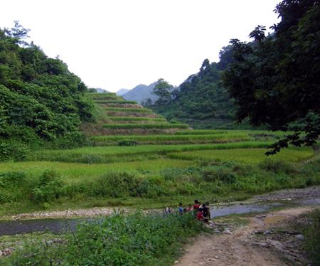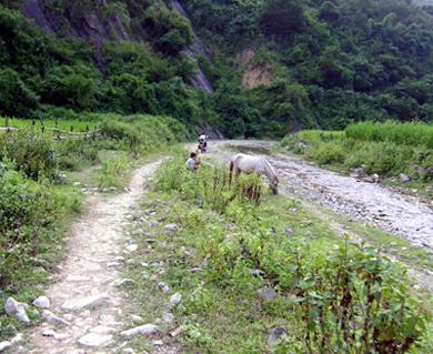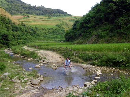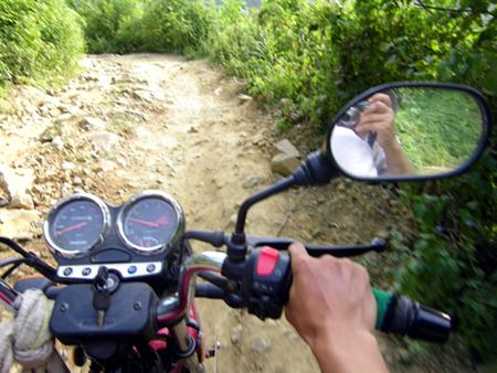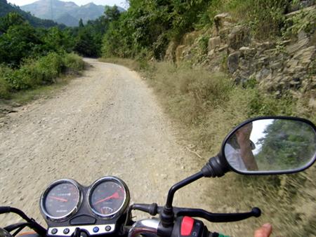 欧老师兄弟三人骑摩托车来接我们,一辆车拉行李,两辆车坐人。从八里(音)拐上去民权的路,就开始给人以刺激:路线崎岖辗转不说,许多路段都是沟壑纵横,碎石嶙峋,山路忽上忽下,多许地方的坡度都在三、四十度以上,还有不少小塌方,将路面遮掩了一半。难怪逻西乡人说,去民权的路一般人不敢走,可民权的人走起来是轻车熟路,骑摩托的技术确实好。这次可叫我们领教了,看着上不去的坡,一加油上去了,看着路断了,一扭把过去了。朱老师说,他们应该参加摩托车越野赛,准保拿冠军。我趁着路途平坦一点的机会,抓空抢拍了几张照片,能看出大致的路况。有几段过河的路段,我乘坐的那辆车的车手有点心虚,我就下来步行,幸亏出发前换上了临时买的迷彩鞋,否则走山路肯定伤脚。不过倒给了我机会拍下朱老师骑乘的英姿,也算是对辛苦步行的一点回报吧。