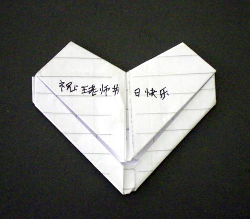 上午第一节就是我的语文课,一进教室,学生们就争先恐后地向我祝贺节日,还有一个叫罗保险的男孩儿竟然仔细折了一只“心”送给我,很欣慰!