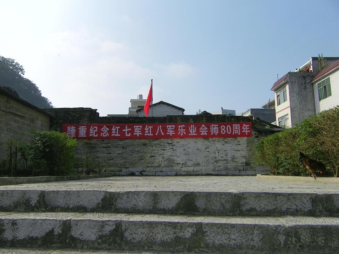 一进县城,就见多处挂着“隆重纪念红七军、红八军乐业会师80周年”的横幅标语,果然人们没有忘记这个日子。红七军、红八军会师纪念馆很好找,是一座清代建筑,山墙结构是“虎座龙头后凤尾”,为广西地区的建筑风格。纪念馆现为省级重点文物保护单位。馆里很清静,没什么人,现场只有一名女馆员,她说:纪念馆的工作人员共4人,其他人8:30就到乐业广场去做宣传了,今天是80周年纪念日,参观的人会多一些。红七军、红八军会师的介绍以文字、照片为主,馆藏文物不多,但能保留并收集到很不容易,十分珍贵。在新中国成立后受衔将军的照片中,我看到了前广西军区司令员欧致富的名字,我的一个学生名叫欧致部,不知是否有家族关系。在这个革命老区,许多红军的后人可能就隐藏在大山深处、百姓群中而不为人所知,因为他们的先人当初参加革命的动机非常纯朴,没有追求荣华富贵、光宗耀祖的奢望,因此,离开队伍后也没想向政府伸手要什么,他们的后人也过着与普通百姓毫无二致的生活,默默地做着共和国的忠实子民。这样的红军战士是真正的无名英雄!