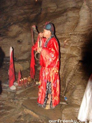 洞内有傩师,正在施法保佑过往行人平安,旁边还有四个小鬼像。