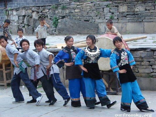 其实上刀山是苗家风俗表演的一种,还有苗家歌舞等,下图是苗家的阿哥阿妹在跳舞。中间的阿妹可是个腕儿哦,还有人专门为她拍摄纪录片,叫老洞苗寨最后的女导游,事实上她现在已经不做导游了,做苗家风俗表演的主持人,灵活把握全场。