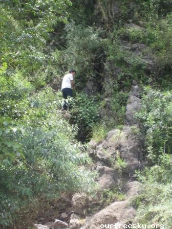 张明老师在给我们探路。从照片上看好像不是很危险,但实际上山的坡度可能达到了60度,只能借助树和草根往上爬,照片的下面就是一条瀑布,因为刚下过雨,所以水量很大,只要一不小心掉下去,很有可能就再也回不了家了。