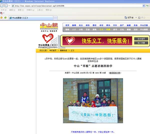 '3h"Ol{b <d&9`e1Hc 标 题:中山“草根”志愿者湘西助学