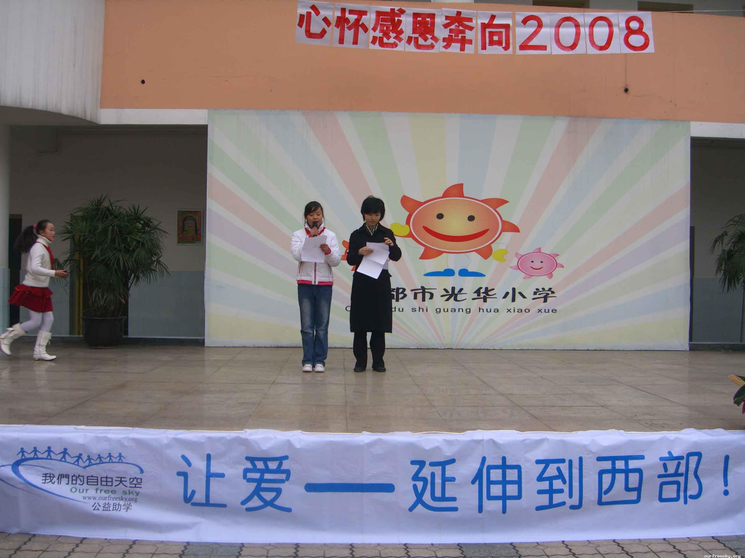 20071117成都市光华街道办事处的捐书活动不成功,街道办事处是支持这项活动的,同意提供场地,但也仅仅是提供场地,没有协助我们做任何宣传,当天没有一个居民参加,到是成都市光华小学来了一个班的同学。他们在老师的带领下每人拿着一本自己平时喜爱的课外读物交给我们,我们也回赠了OFS的名片。这次活动结束之后,我最后一次见到柠檬小熊同学的时候,他曾经告诉我可以找成都市光华小学,学校很支持。但是因为街道办事处的活动当天没有一个居民参加,所以我也没有把再找学校的事放在心上。