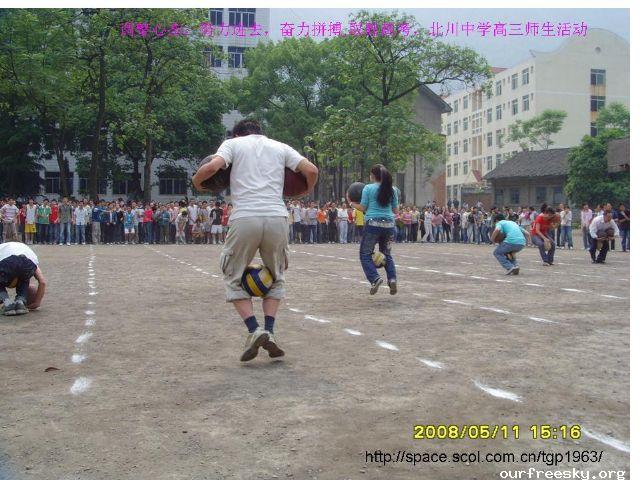 博客照片里在操场上欢笑的学生们,都是高三的孩子。地震前一天,高三年级搞了一个类似趣味运动会的活动。唐老师说,高三的学生很久没有这样欢畅地玩过了,他们一直在为迎接高考而奋战。那天距离高考只剩下了26天。北川中学是绵阳市的示范学校,每年的高考成绩是北川的骄傲。 VyXKZ%\dQ/
