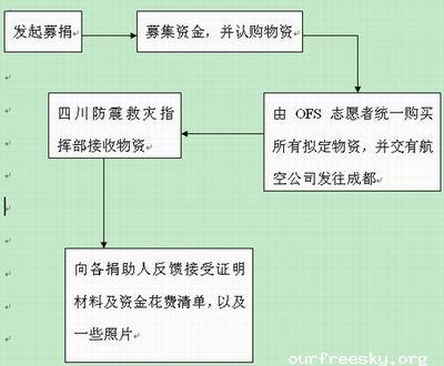 考虑到衣物等物资需要的全新,药品的安全问题,以及为了能够有效的利用国家对灾区捐助物资的绿色通道政策,所能募集到的资金,会由OFS上海或者北京的志愿者统一购买物资,经上海或北京航空公司直接发往四川成都,由防震救灾指挥部门统一调配分发到受灾地区。