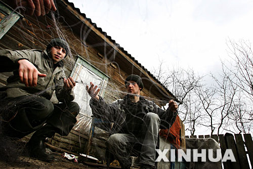 这是2006年4月7日,乌克兰青年在切尔诺贝利核电站隔离区附近的村庄佐林整理渔网。