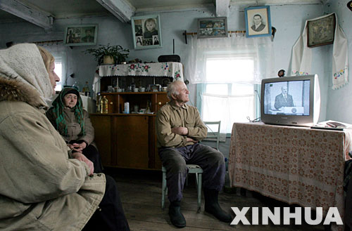 这是2006年4月8日,在切尔诺贝利核电站隔离区附近的一个村庄,白俄罗斯村民在收看白俄罗斯总统卢卡申科就职典礼的电视转播。