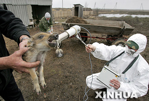 这是2006年4月7日,在切尔诺贝利核电站隔离区内,一名妇女在一座荒芜的白俄罗斯村庄逗弄她的小猪。