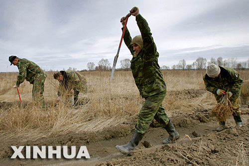 这是2006年4月9日,白俄罗斯工人在切尔诺贝利核电站隔离区附近的一个村庄植树。
