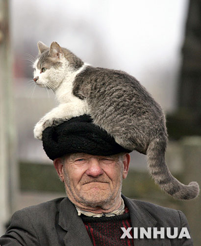 这是2006年4月6日,在切尔诺贝利核电站隔离区附近,一只猫趴在一名白俄罗斯老人的头上。