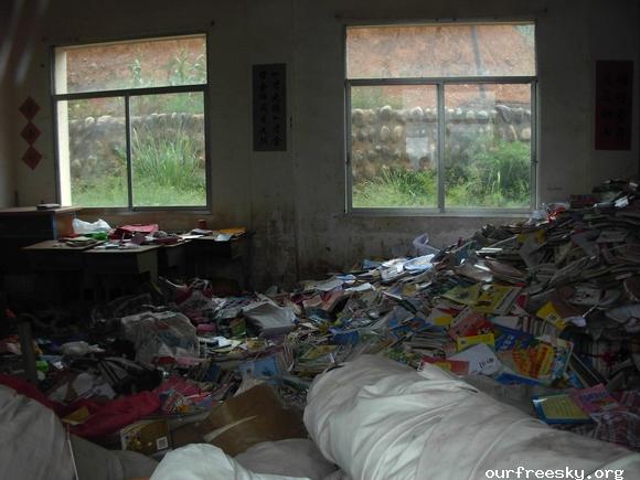 八点过点吧,我们到了竹园小学,见了姚老师还有两位其他老师,问了姚老师图书存放的地方,姚老师就带我们去看了目前图书存放的教室,危楼教室里,锁着的,教室里堆满了图书,书包等,还没地方重新建立图书室,目前就先暂时放教室里了。 -(  ER4#