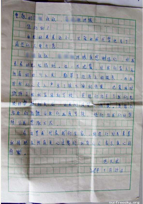 您好!我是5.12特大地震中幸免于难的一名普通学生。在发生地震之后,您给予了我物质上的支持,给予了我强大的精神力量,使我走出了灰暗的天空,光与希望围绕在我身边,特此,我衷心感谢您的支持! [- w%/D%@